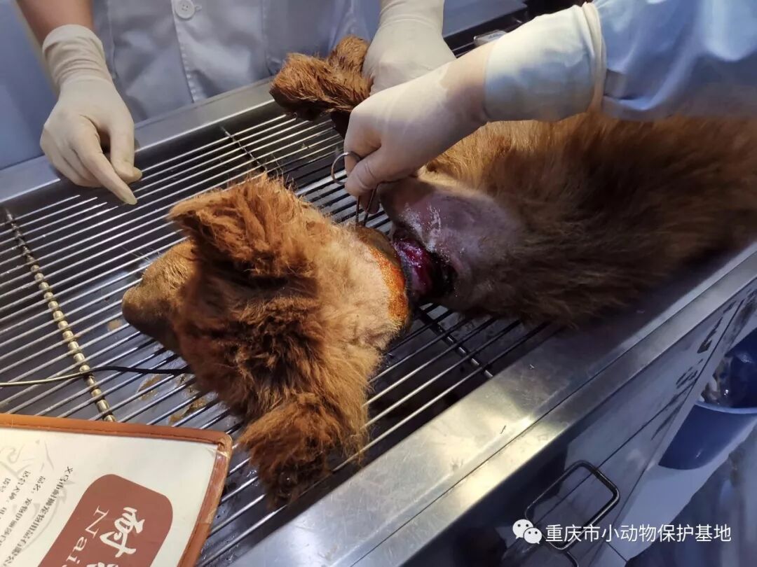有图有真相 大头是我们救助的一只流浪狗狗。脖子被铜丝死死的绑住,救下它的时候,它已经生命垂危。巨大的头和纤细的脖子完全不成比例。按操作流程,本来狗狗应该是在麻醉的条件下,进行剪断铜丝,清洗伤口,这样可以避免狗狗因为疼痛而咬到医生。但友好动物医院的陈建华副院长担心狗狗的身体扛不住第二次麻醉(捕捉的时间已经打过一次),冒着被咬的风险,直接清洗伤口。