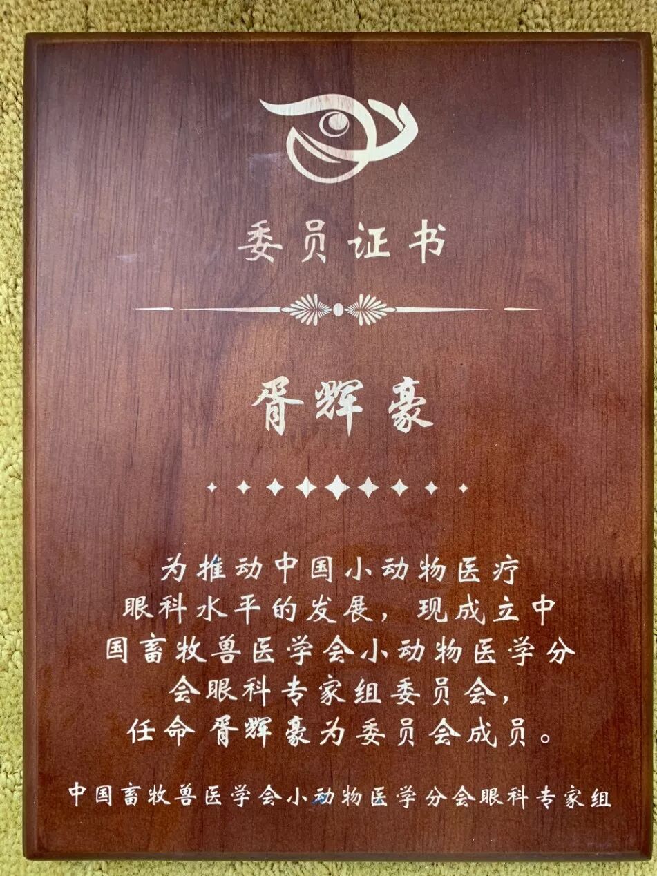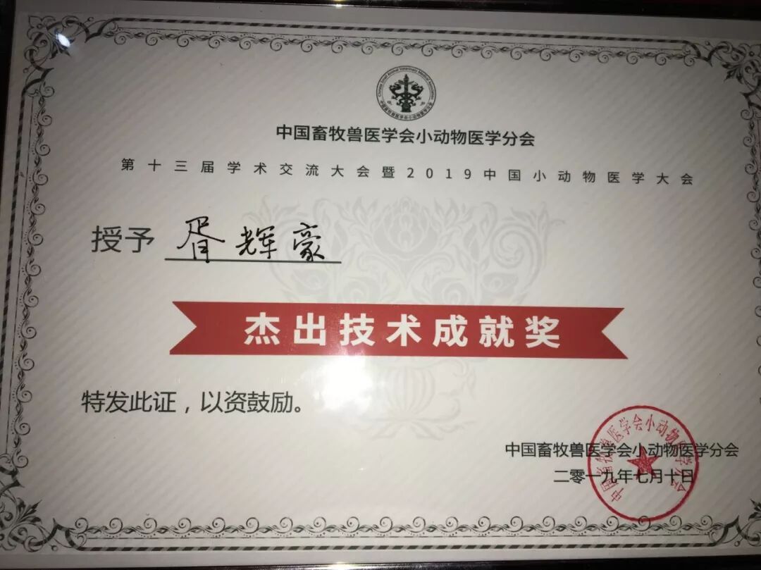 以胥辉豪博士为核心的眼科团队更是整个西部地区唯一率先开展动物眼科学临床、科研与教学的专业团队。胥辉豪老师在多年的教学与临床工作中,更是为我国培养了大批优秀的兽医眼科专科医生,为了表彰与鼓励胥辉豪老师对中国兽医眼科学所作出的贡献,中国畜牧兽医学会小动物医学分会特授予胥辉豪老师“杰出技术成就奖”。