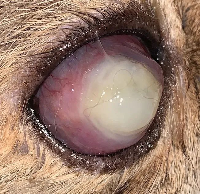 大量眼表脓性分泌物以及角膜变黄和凸起表面猫咪角膜的感染程度非常严重。