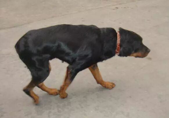 上图为重庆小动物保护协会救助的被遗弃的瘫痪罗威纳犬,经过胥洪灿教授和友好医疗团队的针灸推拿治疗,27天后,恢复了行走功能。